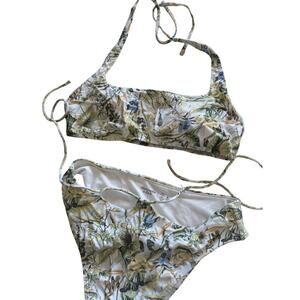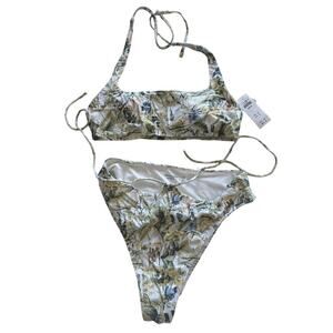 90s Halter Bralette Swim Top with Tie Back High Waisted Cheeky Bottoms Green Print Both Size medium NTW