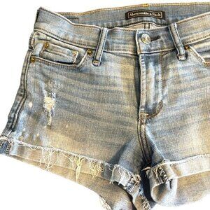 This Abercrombie & Fitch A&F stretch jean shorts feature a light wash with bleach spots and a cut-off design, perfect for casual wear.