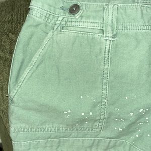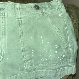 Pretty lighter green Abercrombie & Fitch low rise BF shorts. They have a distressed bit faded look about them. With white “splatters” of color. Sort of a minty color.. with intentional shades of fading here and there.
