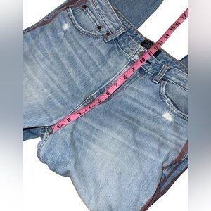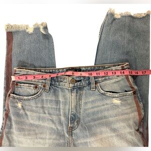 A&F ankle jeans. Distress and frayed. Some intentional “red splatter” markings. Deep red/purple stripes.