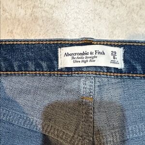 Gently worn Abercrombie & Fitch Ankle Straight Ultra High Rise Jeans women's size 8. Stretch denim, high rise waist, button with zipper fly, five pocket styling, straight fit leg, hits at ankle, destroyed on knees. Offers accepted!