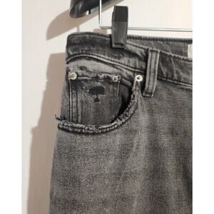 Ultra high rise ankle jeans in a straight and relaxed fit through the calf featuring a grey wash and slightly distressed hem for a vintage feel.
