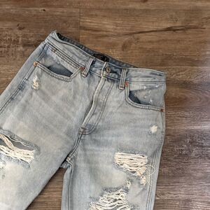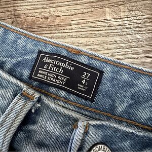 Cute light wash high rise distressed jeans. Straight leg. 5 pocket. Button/zip fly. 100% cotton. In great preowned condition. Abercrombie & Fitch Size 27/4