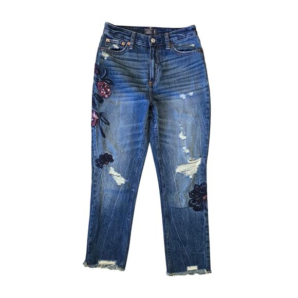 Stylish Annie High Rise Girlfriend jeans by Abercrombie & Fitch featuring a relaxed, flattering silhouette with a vintage-inspired look. Designed with a high-rise waist, classic 5-pocket styling, button-zip closure, and a comfortable girlfriend fit. Medium wash denim with distressed details and floral embroidered accents throughout for a unique, standout style. Marked Short length on interior tag.