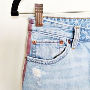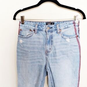 Abercrombie & Fitch Annie High Rise Girlfriend Jeans in a light wash with a red racing stripe detail down the side. Sturdy 100% cotton. Distressed with raw hems. Mom jean vibes.