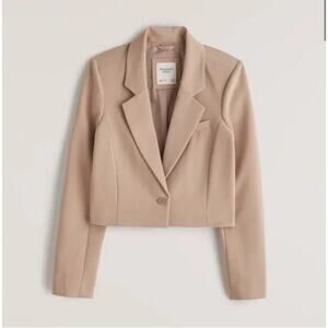 Beige / khaki Vegan Leather Cropped Blazer by Abercrombie & Fitch. This neutral color cropped blazer is a great lightweight layer that will go with almost any outfit! Features a single button front closure, one welt pocket. There are interior tears in the lining near the inside shoulder area (see pics) - these do not affect how the jacket looks when being worn. Bust across the front area measures approx. 19 inches.