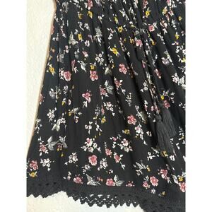 AF black floral long sleeve shorts romper playsuit with crochet hem. Elastic collar, can be worn off shoulder. Elastic cuffs, waist with tie. Lined. Lightweight. Excellent preowned condition EUC, no flaws. Professional, highly rated seller, quick shipper, open to offers!