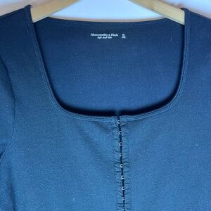 This classic black bodysuit from Abercrombie & Fitch is a versatile essential for any wardrobe. Made from soft, stretchy fabric, it features long sleeves and a flattering square neckline. The front is detailed with small buttons, adding a subtle touch of style to the simple design. With its snug fit and snap closure at the bottom, this bodysuit is perfect for layering or wearing on its own for a sleek, minimalist look.