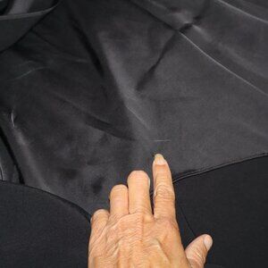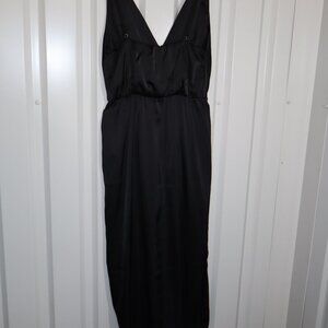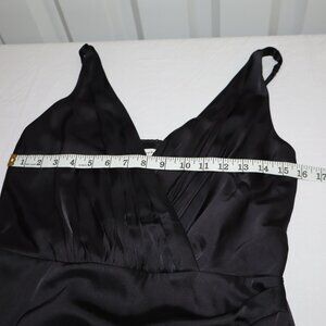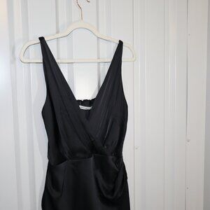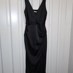 Elegant black midi dress with a deep V-neckline. Features a stylish side slit. Perfect for evening wear.