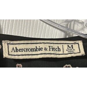 This is an Abercrombie & Fitch black mini dress in size Medium. It features a paisley pattern, long sleeves, round neck, hook & loop closure, and is made of lightweight polyester material. The dress has button and zipper accents, and is machine washable. It is styled as a short dress with a regular fit for women.