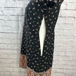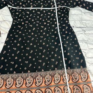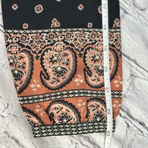 Vintage Abercrombie & Fitch boho-inspired dress in black with small rust floral ditsy print and paisley border. Features: