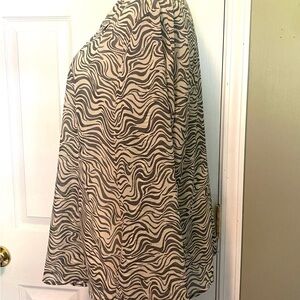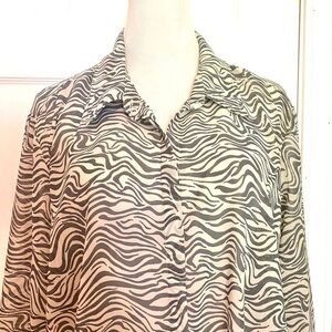 This top showcases a bold black and white pattern, perfect for making a statement. The notched collar and boxy silhouette add a modern touch, making it a versatile piece for any occasion. Great for office wear, luncheon, date night, animal print, art to wear.