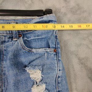 Stylish blue jean shorts. Distressed design. Perfect for casual wear. High Rise Mom Short 27/4