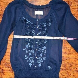 This is a very cute, feminine Abercrombie & Fitch blouse in navy blue with floral embellishments on the front. It has button details along the front and on the ends of the sleeves and ruched elastic around the waist. This top could be worn with dress pants/slacks to work or the office, under a sweater or blazer, or with some jeans or shorts. Very cute top to dress up or dress down!