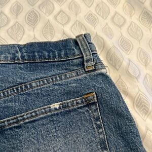 These Abercrombie & Fitch jean shorts feature a distressed, cut-off style with a raw, frayed hem for a casual look. The blue denim has a light to medium wash with natural fading, giving it a vintage, worn-in appearance. Perfect for adding a relaxed vibe to your summer wardrobe.