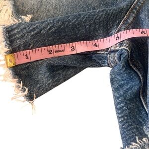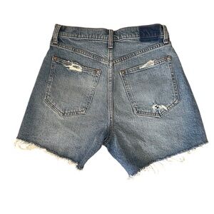 These Abercrombie & Fitch jean shorts boast a high-waisted design with a distressed, vintage appeal. The medium-to-light blue wash and raw, frayed hems offer a laid-back, casual style perfect for everyday wear. Excellent used condition, pet and smoke free home!