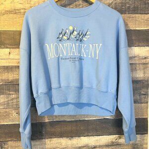 This medium blue crewneck sweatshirt features a Montauk-NY graphic and a soft cotton blend material, offering a relaxed and comfortable fit.