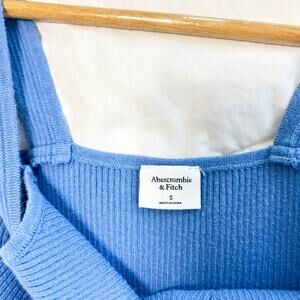 Abercrombie & Fitch ribbed knit bodysuit in a vibrant blue color. Features wide straps, V-neckline, stretchy ribbed fabric, and snap button closure at the bottom for convenience. A flattering and versatile piece that can be styled with jeans, skirts, or layered under jackets.