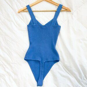 Abercrombie & Fitch ribbed knit bodysuit in a vibrant blue color. Features wide straps, V-neckline, stretchy ribbed fabric, and snap button closure at the bottom for convenience. A flattering and versatile piece that can be styled with jeans, skirts, or layered under jackets.