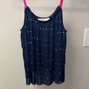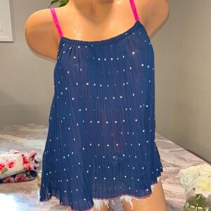Chic blue tank with white polka dots. Features vibrant pink straps. Lightweight and sheer.