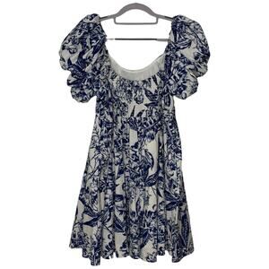 Chic off-shoulder mini dress. Features blue floral pattern on white fabric. Puff sleeves add elegance.