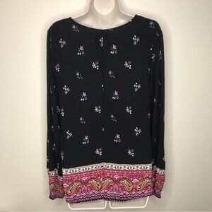 Abercrombie & Fitch Boho Split V Neck Black Red Paisley Border Print Blouse Med
