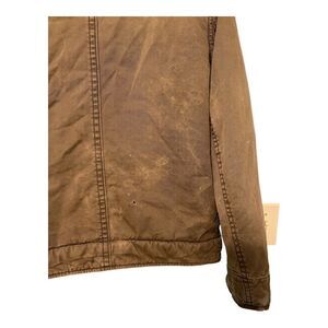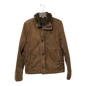 Abercrombie & Fitch Boys Jacket in size XL, featuring a faux fur lined interior for warmth. This brown Y2K style jacket has a zip closure and is made of 100% cotton. It is a basic jacket suitable for boys. Slightly Distressed.