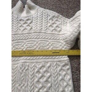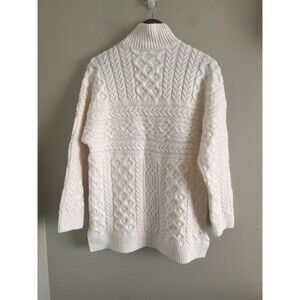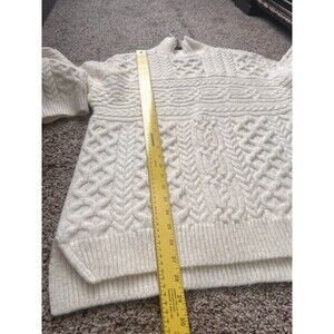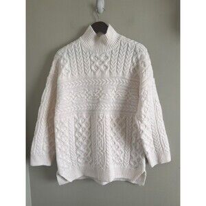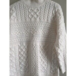 The product is a stylish and cozy Abercrombie & Fitch brown cable knit chunky women's ivory sweater in size M. This sweater features a solid pattern, long sleeves, and a pullover style. Made with knit fabric, it is machine washable and perfect for casual occasions during the winter, fall, or spring seasons. The sweater embodies a classic yet trendy look, making it a versatile addition to any woman's wardrobe.
