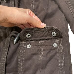 Thick winter jacket. Brown shell with red lining. Missing zipper hood attachment. Inside is warm. Zipper along with clasp for jacket closure. Furry detail along the neck. Button-close for the wrist. 2 front pockets that are snap button. Shell 100% cotton. Body lining 100% cotton.