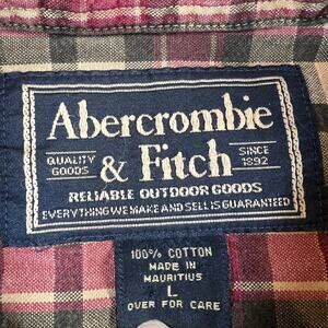 Abercrombie & Fitch Button Down Shirt Men's size Large Long Sleeve 100% Cotton. Red, Olive Green, Tan Plaid. The photos showing the brand tag are the most accurate representation of the true color of the shirt. Medium to heavy weight fabric with the feel of flannel but a softer finish. Good pre-owned condition, beginning to show signs of wear at the collar, left cuff, and bottom hem. See photos.