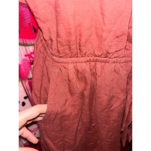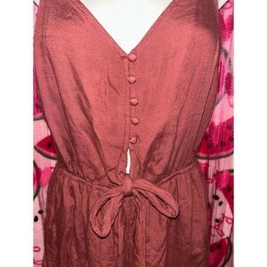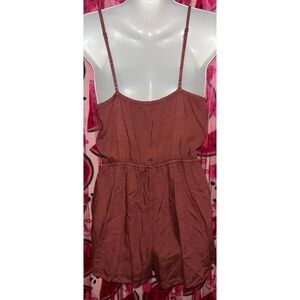 Stylish rust red romper with button-front detail and tie waist. Has pockets on the side and adjustable straps. Perfect for casual outings. In great condition.
