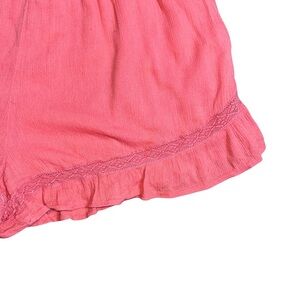 Stay cool and stylish with these Abercrombie & Fitch coral pink ruffle hem shorts in size Medium. These lightweight shorts feature a flowy boho silhouette, elastic waistband for comfort, and feminine ruffle & lace trim details.