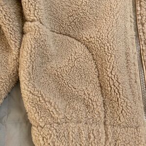 Super soft and cozy Abercrombie cream and taupe zip up sherpa jacket with side pockets and breast pocket.