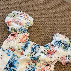 This stylish blouse features a charming puff sleeve design with a ruffled crop style, perfect for a chic look. The cream and blue floral pattern adds a touch of elegance, while the lightweight fabric ensures comfort for spring and summer days.