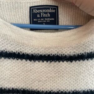 This Abercrombie & Fitch sweater features a classic cream and blue striped pattern, offering a nautical-inspired look. Crafted with a comfortable crew neck and long sleeves, it's perfect for casual outings. The knitted texture adds a touch of timeless style to your wardrobe.