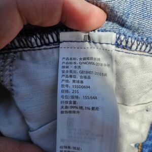 Distressing includes chewed hems at the back of the ankles, one busted knee, and some distressed patches higher up.