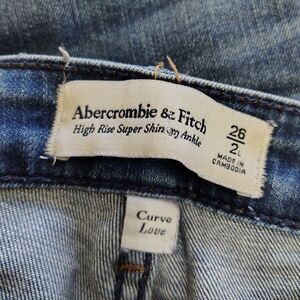 A&F Abercrombie & Fitch 2L 2 Long 26 Women's Teen Girls Curvy Love Distressed Button-Fly High Rise Super Skinny Ankle Jeans with raw destructed hem. 25" waist at rise, 11" rise, 27" inseam.