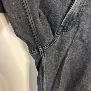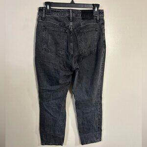•On-trend high rise mom jeans in our all-day comfort stretch denim, with a black wash and distressed hem.