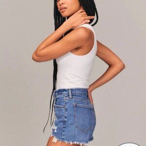 Trendy Abercrombie & Fitch “The Mom Short” in the coveted Curve Love fit. Medium wash denim with heavy distressing and raw frayed hems for a laid-back, vintage vibe. High-rise waist with a classic 5-pocket style and zip fly.