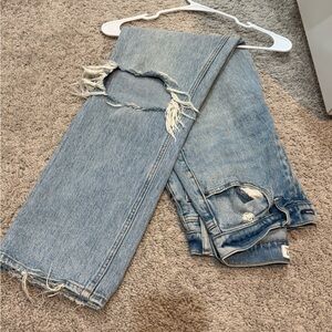 Classic straight leg jeans with a distressed look. Light blue color adds a fresh touch. Perfect for everyday wear.