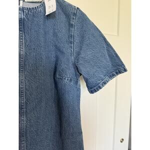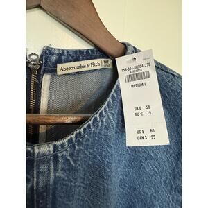 The product is a brand new with tag Abercrombie & Fitch denim dress in a size medium tall, designed for women. The dress features a shift style with mini pockets, made from denim fabric in a blue color. With a short dress length, this piece is perfect for a trendy and casual look.