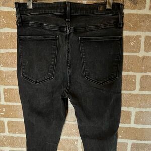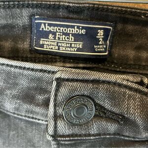 Abercrombie and Fitch, Simone high-rise super skinny jeans in black with distressing. Size 26/2s with waste measurement of 13 1/2 inches across, inseam length of 26 1/2 inches, and 10 1/2 inch rise.
