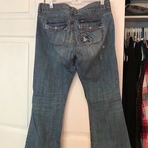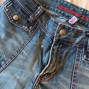 A&F distressed bootcut jeans with pink stitching. Worn maybe once. Size 8 (34”) Snap bottoms on waist and front and back pockets. Inseam is 32”.