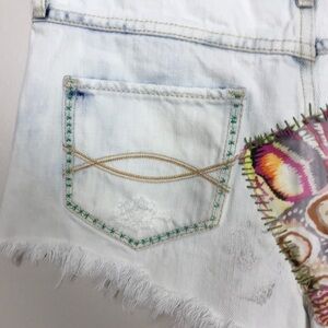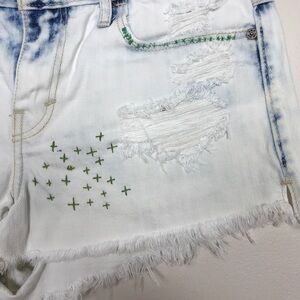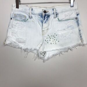 Cute Abercrombie & Fitch cutoff jean shorts. Very light wash, distressed, with patches and hand-embroidered details. Classic 5 pocket style. Great condition. Size 27 (4).