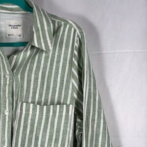 Abercrombie & Fitch striped romper, drawstring waist, button down, collared, long sleeve dress, green and white stripes, casual, pocket front, linen blend, relaxed fit