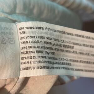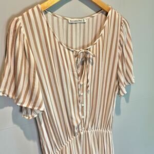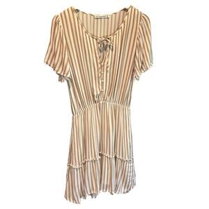 Short sleeves. Button front at the chest with keyhole and fabric tie. Defined elastic waist. Ruffle trim skirt. Lined. Tan and cream striped print.