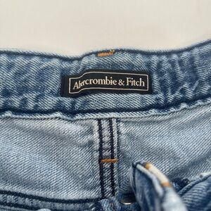 Abercrombie & Fitch presents Aztec-themed Embroidered Boyfriend Cutoff Denim Shorts in a size 28 for women. These blue shorts feature a button closure, made from a cotton blend fabric with a denim texture. The exterior showcases vibrant multicolor Aztec embroidery, a regular fit, and a 2.0-inch inseam.