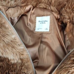 abercrombie faux fur jacket, brown cropped coat, size xs, plush winter outerwear, cozy zip front layer, duck down fill, cold weather fashion, wide collar faux fur, trendy warm layering piece, trending, tailor swift, furry, plush, fun, teddy