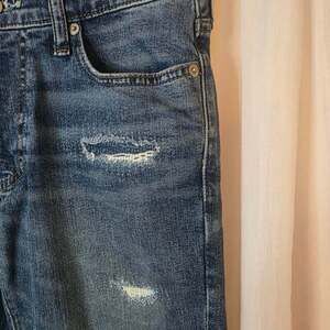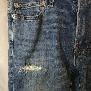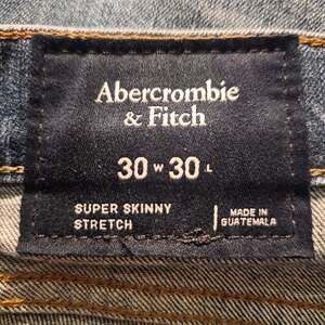 Abercrombie & Fitch Felix Ripped Super Skinny Stretch Denim Jeans, men's size 30W x 30L. These stylish blue jeans feature distressed and ripped details on the knees and thighs, offering a contemporary streetwear look. Made with super skinny stretch denim for comfort and flexibility. Excellent pre-owned condition with factory distressing; no additional flaws.