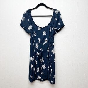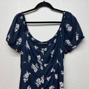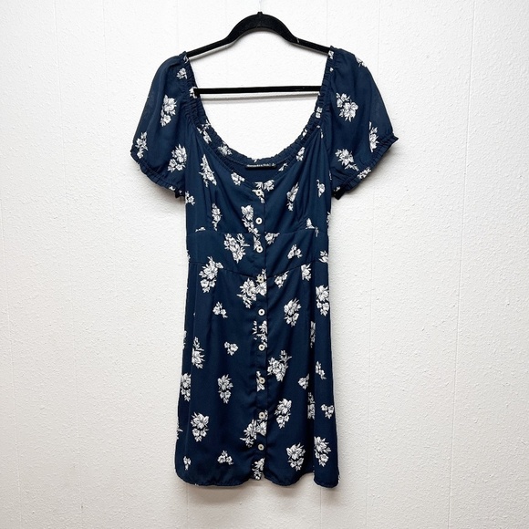 Abercrombie & Fitch women's floral babydoll dress. Navy blue & white. Scoop neck. Short puff sleeves. Button down. Ties in back. Lined except sleeves. In good used condition. No stains, tears or holes.